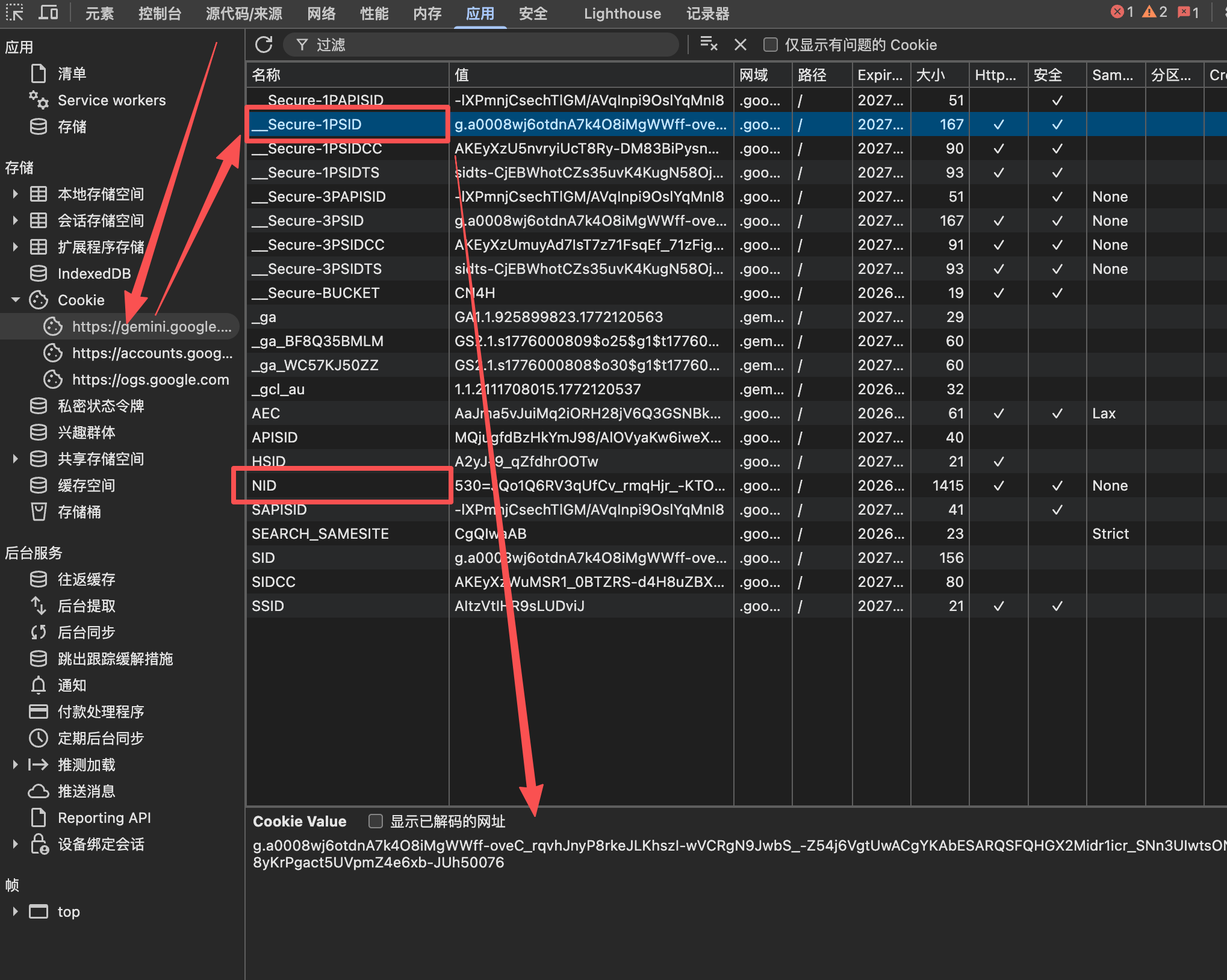 打开 Gemini 官网 控制台,在 Cookie 中找到 __Secure-1PSID 和 NID,然后把他们的值通过 :: 拼接起来,格式为:__Secure-1PSID的值::NID的值