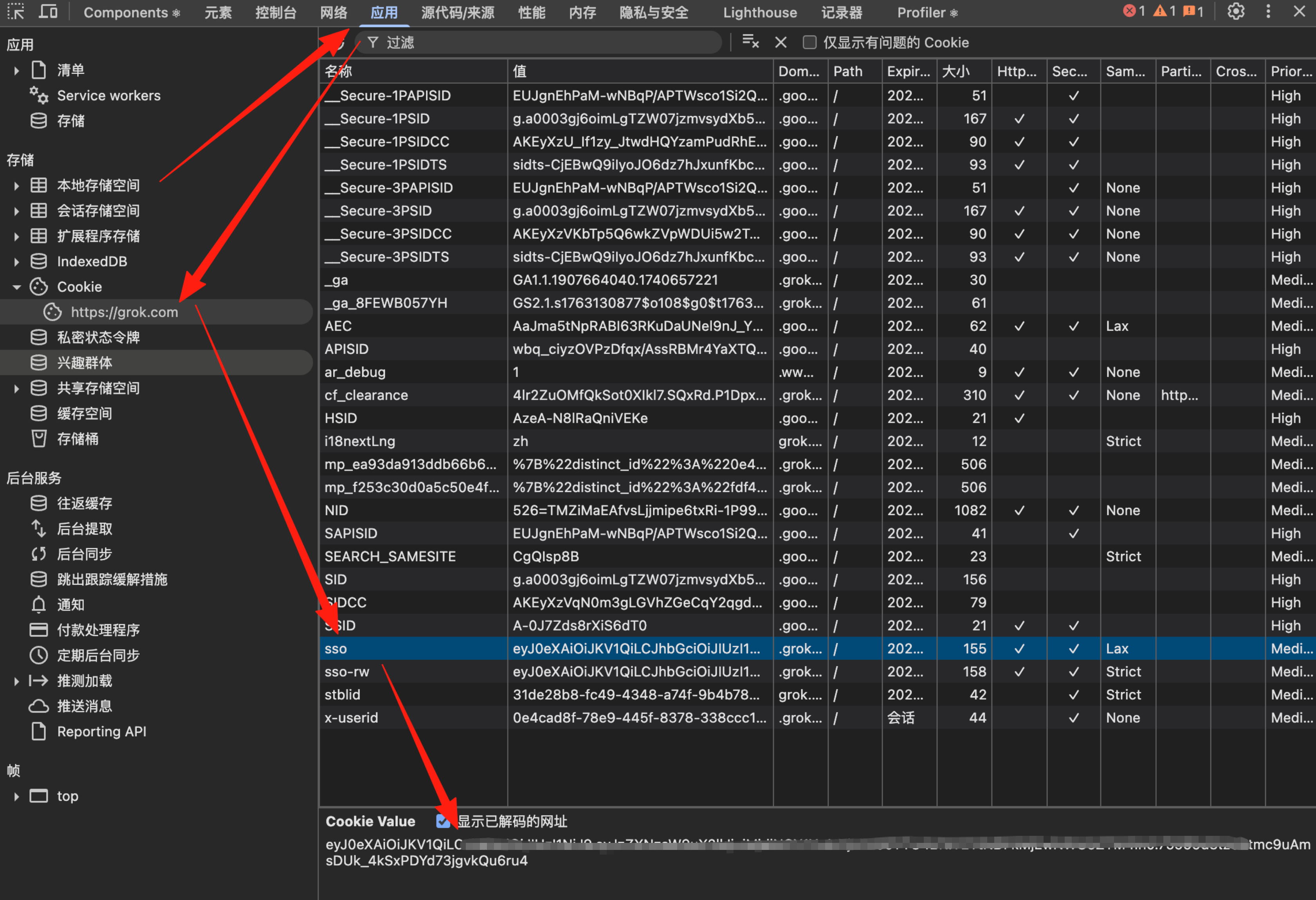 打开 Grok 官网 控制台,在 Cookie 中找到一个名为 sso