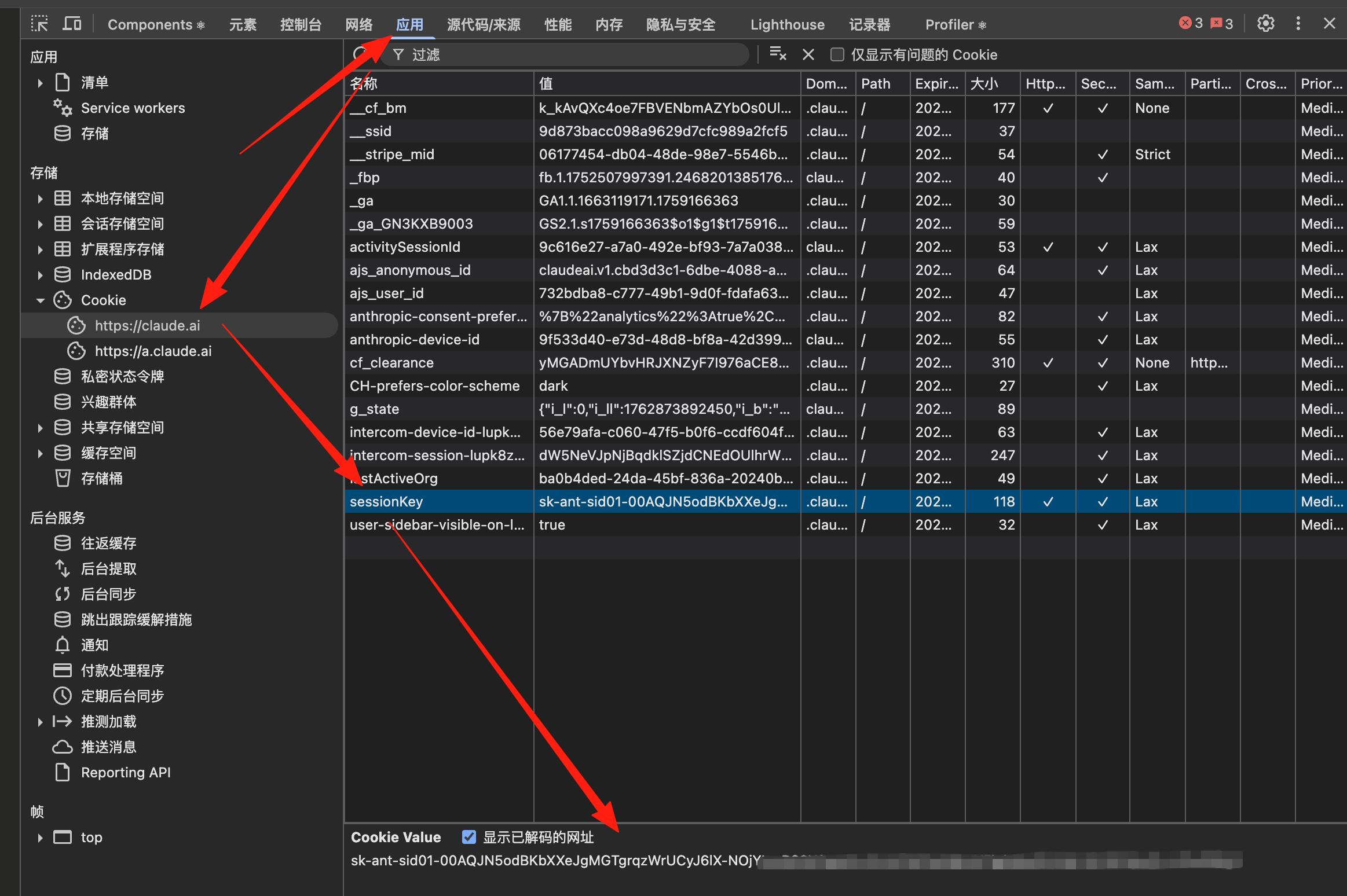 Anthropic 平台有 Claude官网、Claude Code两个平台,都需要打开 Claude 官网 控制台,在 Cookie 中找到一个名为 sessionKey