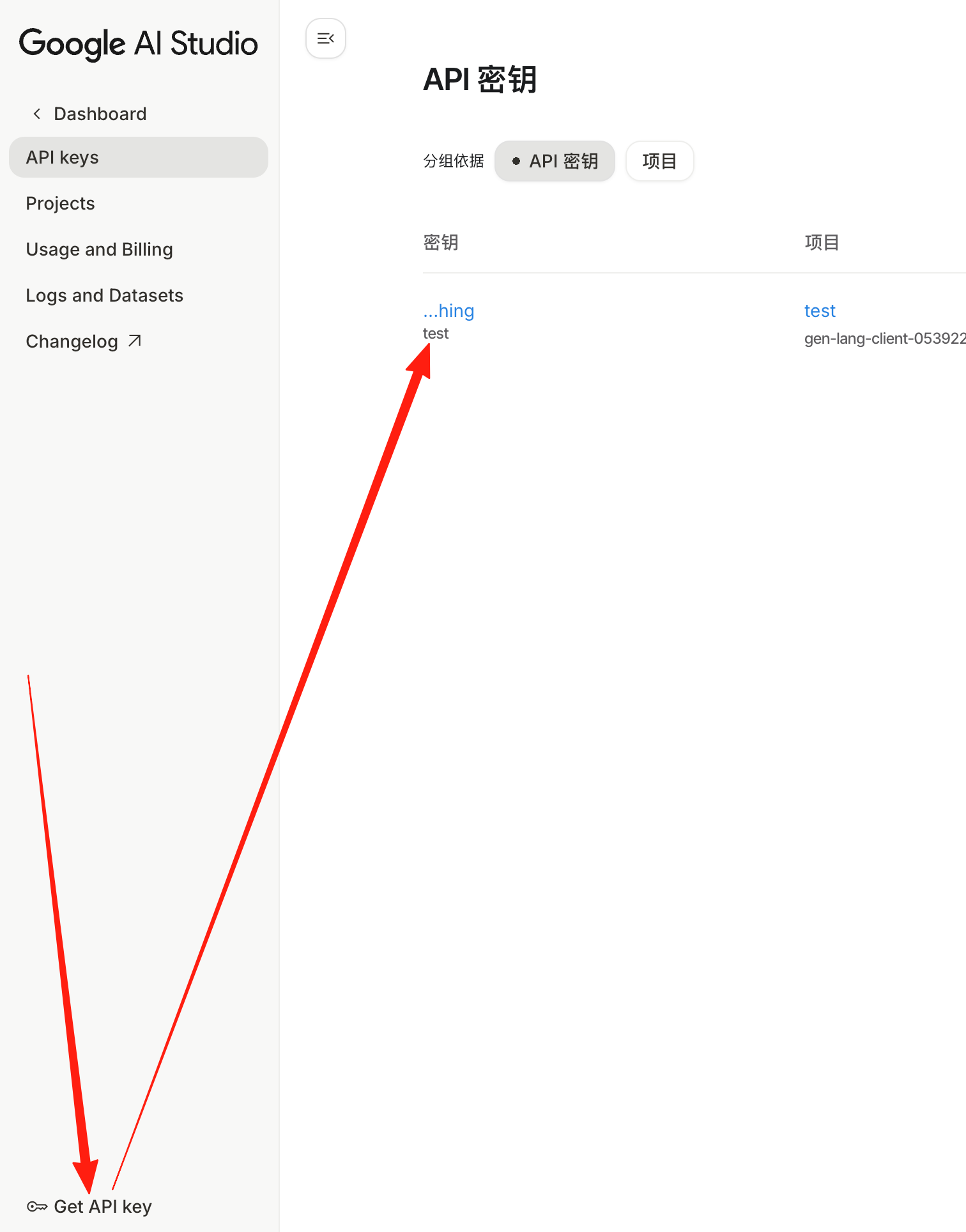 打开 Gemini AiStudio 控制台,点击底部的 Get API Key 然后创建或查询已存在的 API KEY