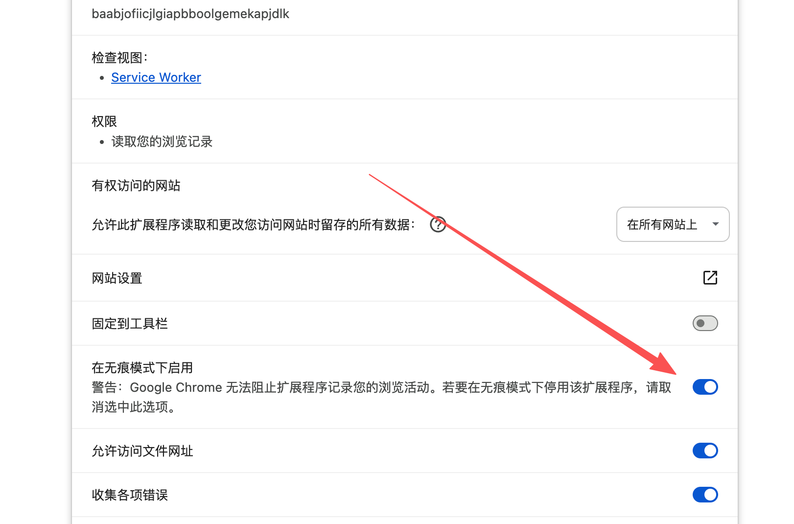 全程加号必须在谷歌的无痕浏览器中进行,请确保在插件详情中打开【在无痕模式下启用】选项