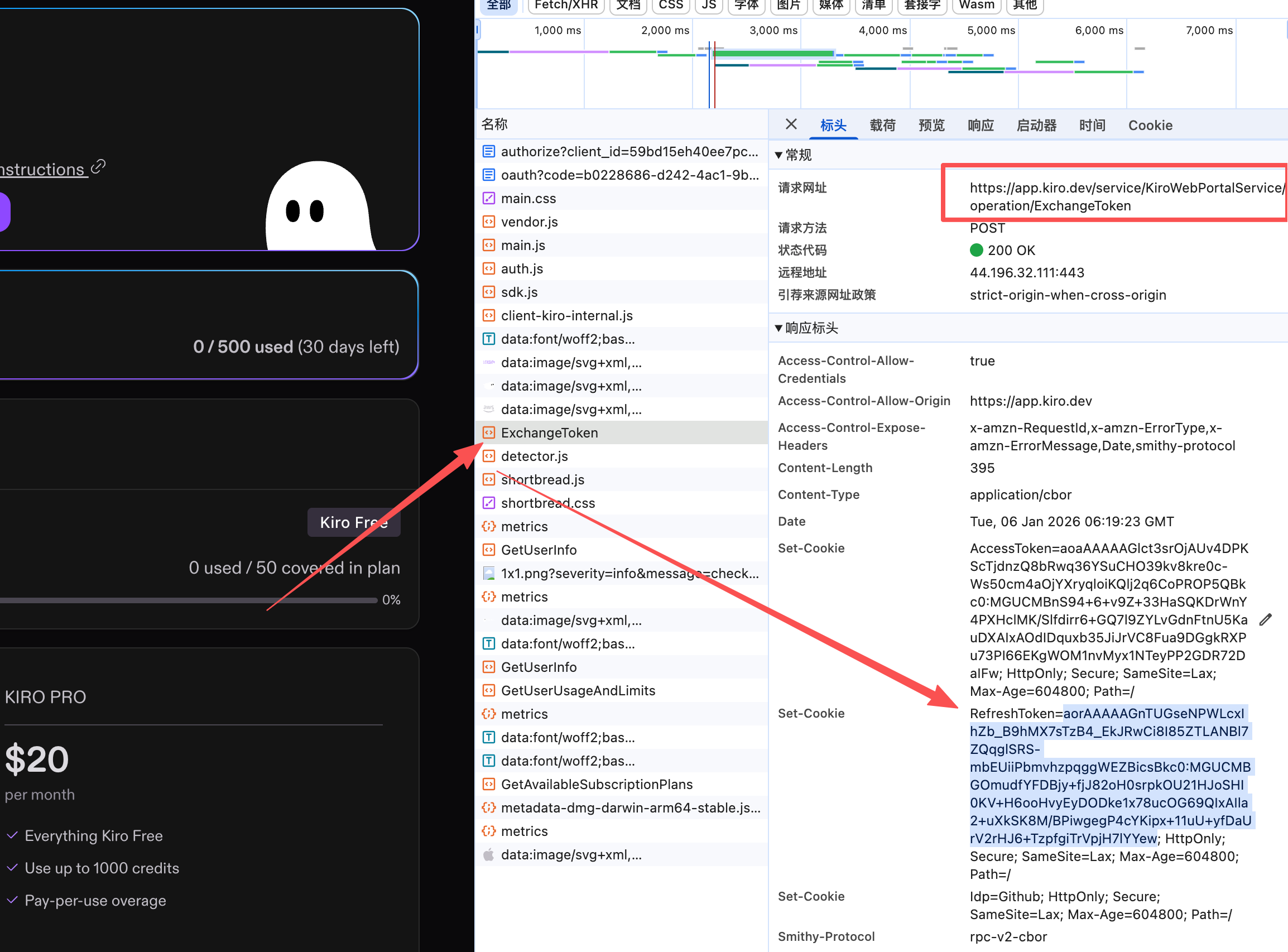 打开 Kiro 官网 的开发者控制台,在登录后抓取一个后缀为 ExchangeToken 的接口,在 Set-Cookie 中找到 RefreshToken